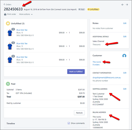 Here’s a screenshot of an example order from The Iconic, showing what an order will look like in Shopify.