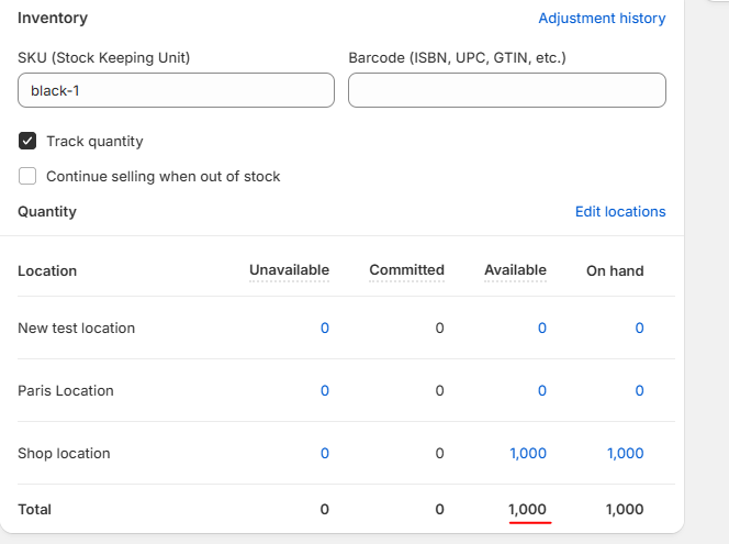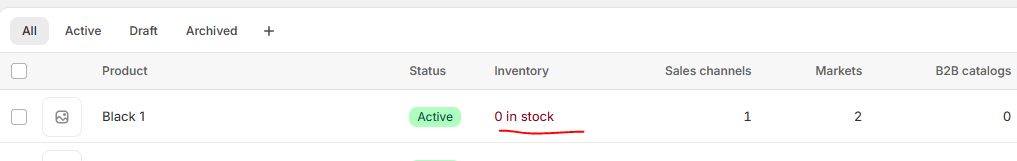 Inspecting the SKU for the Order with issue In this case we, need to check the inventory of product with SKU = black-1 in Shopify. The black-1 SKU has 0 stock in this case that's why the order failed to process or create in Shopify