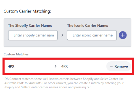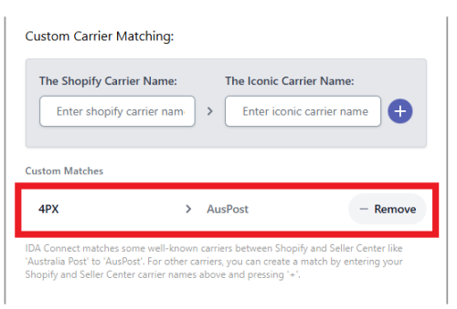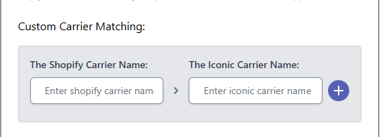 - Enter the Shopify carrier name (the carrier used to fulfill the order in Shopify) along with the corresponding Iconic Carrier name. Be sure to click the + button to add them. Once added, the custom matches will be registered below.