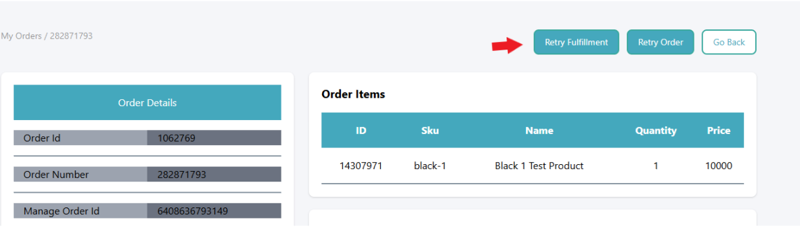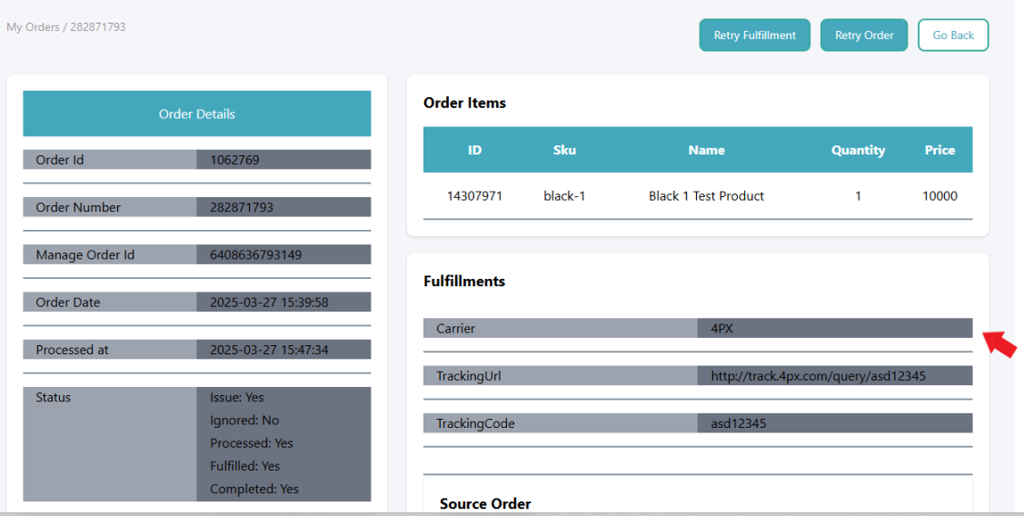 - Once the custom carrier is added and updated, go to the specific order that failed and click the Retry Fulfillment button to push the fulfillment to Iconic.